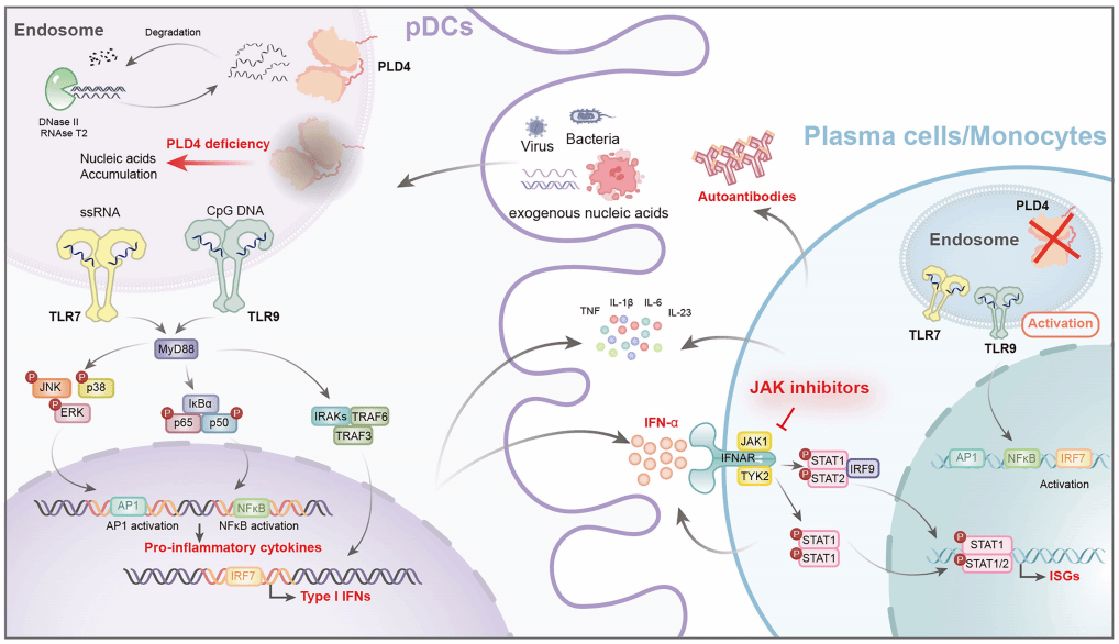 图1. PLD4基因功能缺失性突变导致SLE的核心致病通路和关键效应细胞。