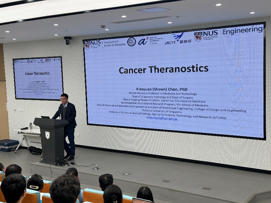 在学术报告环节,新加坡国立大学陈小元教授作了题为“Cancer Theranostics” 的报告,深入阐释诊疗学(Theranostics)的概念,即结合治疗(therapy)与诊断(diagnostics),致力于开发分子诊断测试与靶向治疗,以实现个体化治疗。陈教授详细介绍了放射治疗学与免疫治疗学的最新研究成果,尤其是针对肿瘤和传染病的新型mRNA纳米疫苗配方,并展望了未来发展,为与会者带来全新的视角和研究思路。
