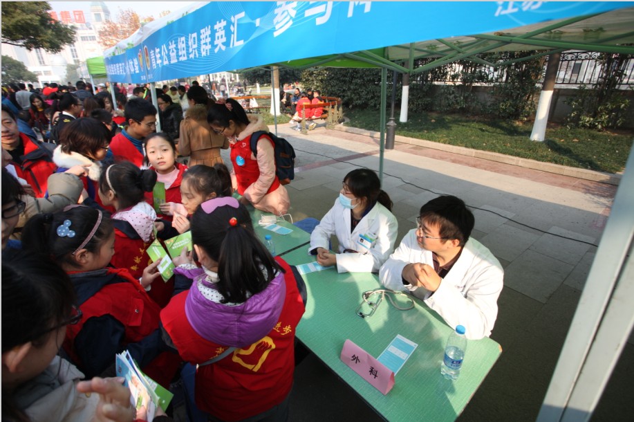 2013年12月5日是第28个“国际志愿者日”。为庆祝国际志愿者日的到来,由鼓楼医院、儿童医院、胸科医院青年志愿者组成的“南京鼓楼医院青年志愿者联盟”于12月1日参加了由共青团江苏省委、  江苏省志愿者协会举办的主题为“大家一起High,志愿服务很精彩!”的公益组织嘉年华活动。