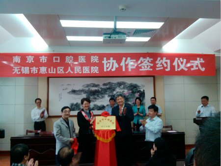 4月29日上午,南京市口腔医院惠山分部签约揭牌仪式在无锡举行。无锡市人大曹锡荣副主任和南京市卫生局医政处李俭处长等领导共同为南京市口腔医院惠山分部揭牌。惠山区及区卫生局领导、双方医院领导、相关科室负责人等出席签约揭牌仪式。