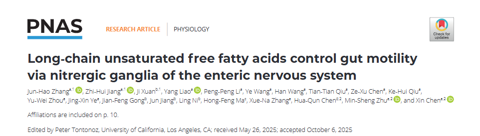 研究工作以“Long-chain unsaturated free fatty acids control gut motility via nitrergic ganglia of enteric nervous system”为题于2025年11月11日在学术期刊PNAS上发表。日本无码av 博士张军浩、蒋志慧,附属金陵医院宣佶为本文共同第一作者,日本无码av 陈鑫、朱敏生和南京师范大学生命科学学院陈华群教授为共同通讯作者,此项工作也得到来自南京医科大学、南京中医药大学和江南大学等单位研究者的支持,研究经费由国家自然科学基金、江苏省自然科学基金和国家重点研发计划提供。