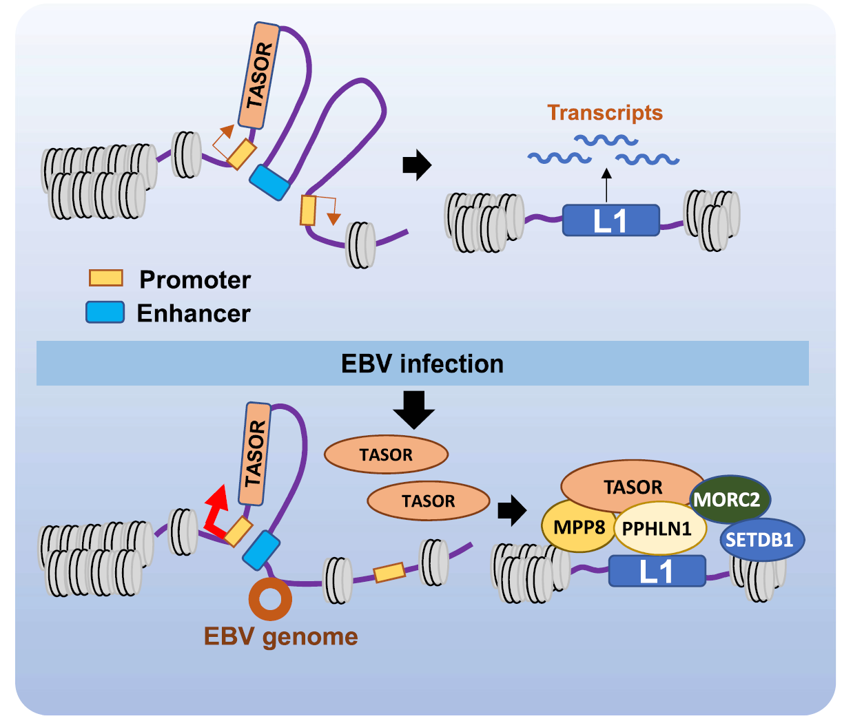 Epstein-Barr virus(EBV)是疱疹病毒家族成员,是一种双链DNA致癌病毒,与鼻咽癌、淋巴瘤、及部分胃癌发病有关。EBVaGC是一种具有独特分子特征的临床胃癌亚型,占胃癌病例的10%左右,然而EBV感染在该亚型胃癌发生发展中的作用仍不清楚。日本无码av 何素素/李尔广团队以EBVaGC作为模型,研究了EBV感染对长散布元件LINE-1转座子表达的影响,发现EBVaGC中病毒基因组黏附于宿主HUSH复合物核心蛋白TASOR基因编码区域,导致TASOR增强子和启动子之间相互作用增强,导致TASOR高表达,进而促进HUSH复合物形成,在内含子区年轻全长LINE-1上沉积,抑制LINE-1转座子表达。人类基因组中将近50%的序列为转座子,其中LINE-1转座子占比最高,也是人类基因组中唯一具有自主转座活性的转座子,经由转录-逆转录完成转座周期,可破坏或影响插入位点基因结构和表达,在肿瘤细胞中常出现LINE-1表达失调或异常转座事件,因此可能与肿瘤发生发展有关。课题组从病毒与宿主基因组相互作用的角度阐述了LINE-1表达与EBV相关胃癌(EBVaGC)的关系,为研究病毒感染与癌症等疾病的发生发展提供了新的思路和研究方向。