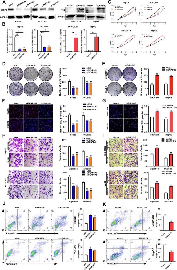 图2. SENP3 在体外促进 HCC 细胞恶性表型的形成
