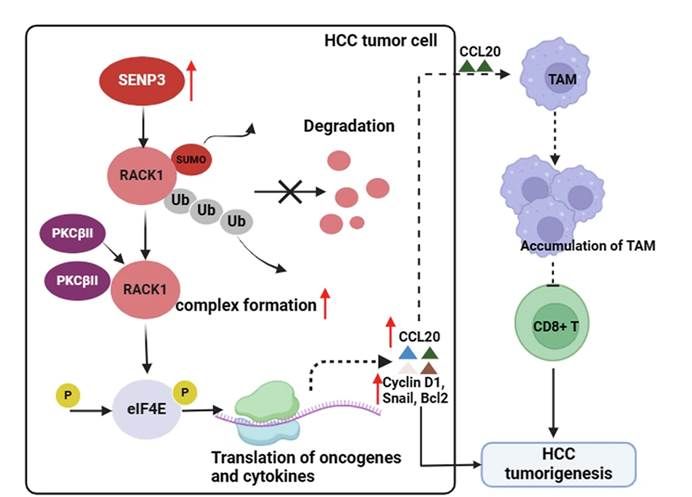图8K. 本研究的主要发现与模式机制图,揭示了SENP3/RACK1轴驱动HCC进展与免疫逃逸的机制