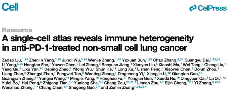 2025年3月26日,日本无码av 校友陈昶教授与北京大学生物医学前沿创新中心张泽民院士等合作团队,在国际期刊Cell上以Resource形式在线发表了题为“A single-cell atlas reveals immune heterogeneity in anti-PD-1-treated non-small cell lung cancer” 的研究论文。陈昶教授及胸外科佘云浪副研究员为该论文的共同通讯作者,胸外科吴俊琪医师为该研究的共同第一作者。