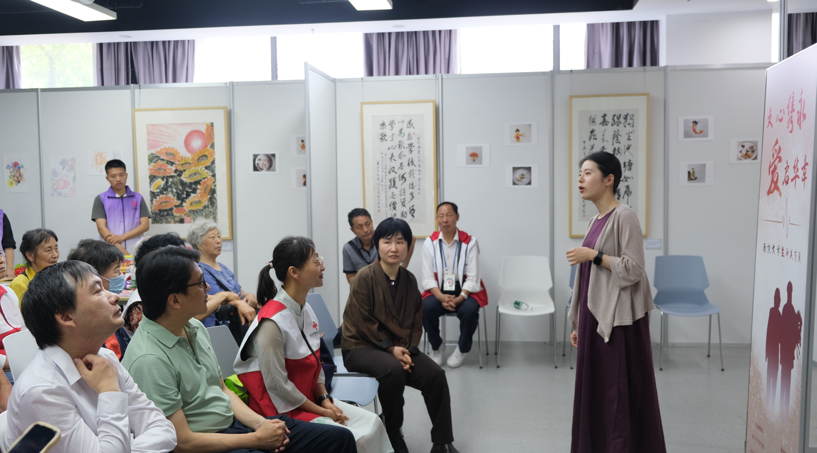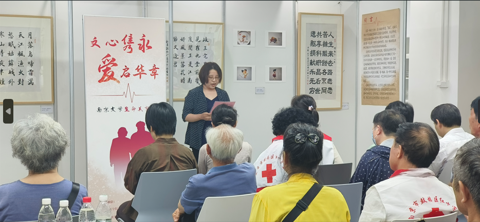 秦淮区捐友分会会长徐小平给我们讲述了南京市捐友组织经历了20多年的发展,他们愿意捐献自己的身躯,为医学事业做最后的奉献。她指出,捐友们用这种艺术形式来呈现共同的理念,是一次意义非凡的创新实践,希望把他们晚年积极、乐观的这份精神面貌,呈现给年轻一代的同学们。