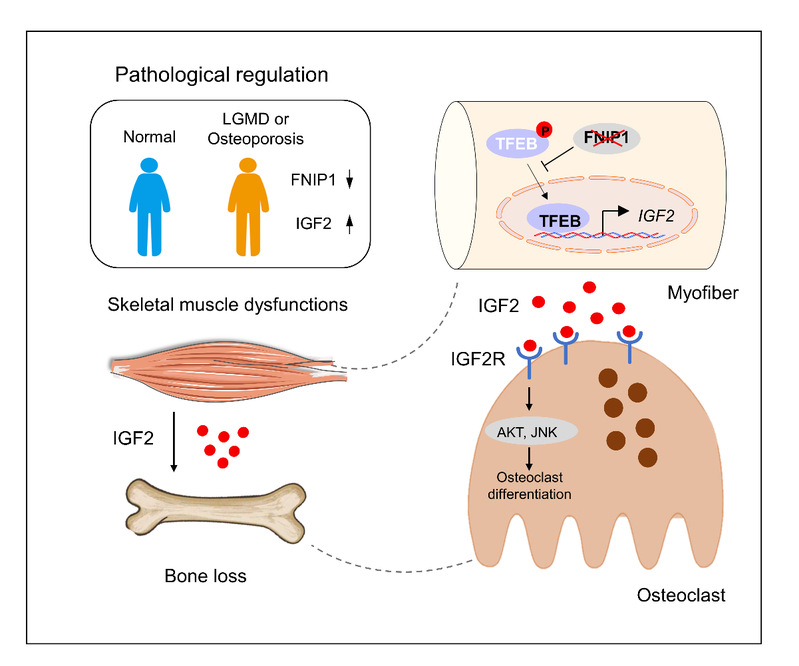 该研究发现了一个全新的肌-骨对话轴介导肌源性骨质丢失发生;揭示了IGF2作为促破骨肌肉分泌因子新的重要功能;提出了FNIP1-TFEB-IGF2信号轴是肌肉疾病和骨质疏松症的潜在干预靶标。