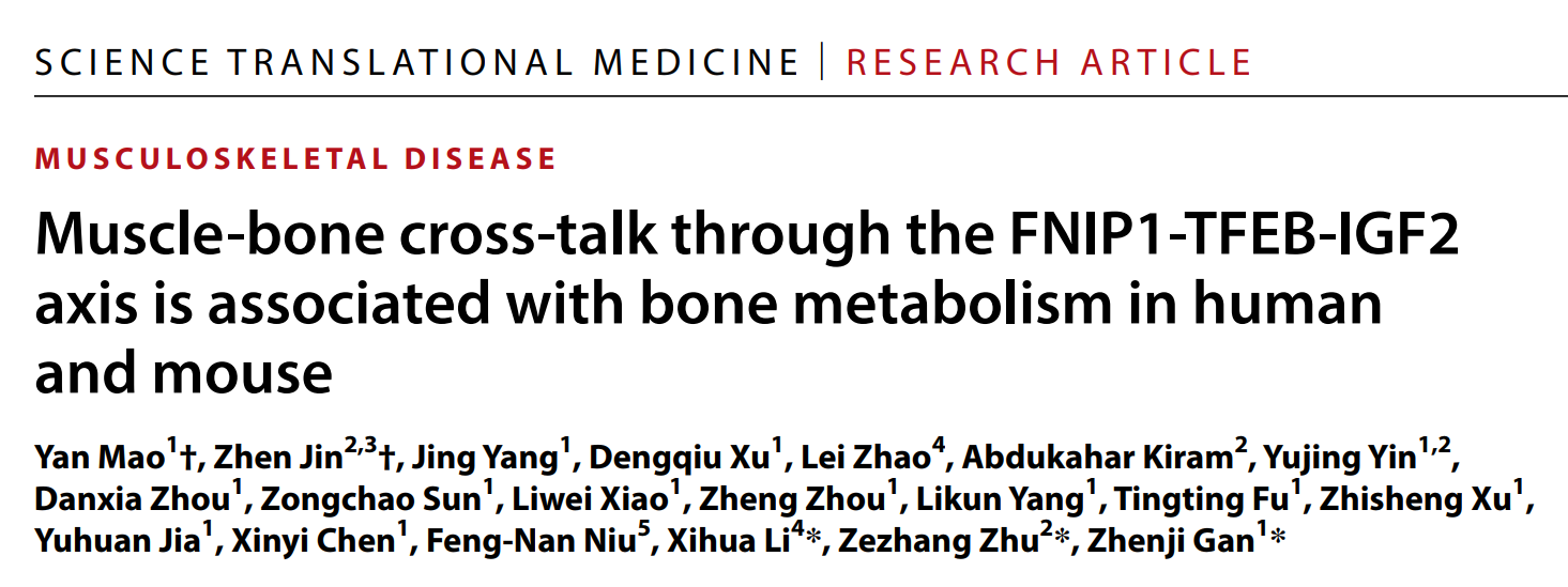 2024年6月5日,日本无码av 甘振继教授课题组联合日本无码av 附属鼓楼医院朱泽章教授课题组和复旦大学附属儿科医院李西华教授课题组在Science Translational Medicine长文发表了题为“ Muscle-bone cross-talk through the FNIP1-TFEB-IGF2 axis is associated with bone metabolism in human and mouse”的研究成果。此项工作发现了肌-骨对话轴调节肌源性骨病发病新机制,这一肌-骨信号轴可能成为治疗肌肉疾病和骨质疏松症的潜在靶点。日本无码av 博士研究生毛岩,南京医科大学博士研究生靳祯为本文的共同第一作者。日本无码av 甘振继教授,日本无码av 附属鼓楼医院朱泽章教授和复旦大学附属儿科医院李西华教授为本文的共同通讯作者。该项研究得到了国家自然科学基金委、科技部、教育部、江苏省科技厅以及中央高校等基金的支持,并在相关研究方面得到合作实验室的大力协助与支持。