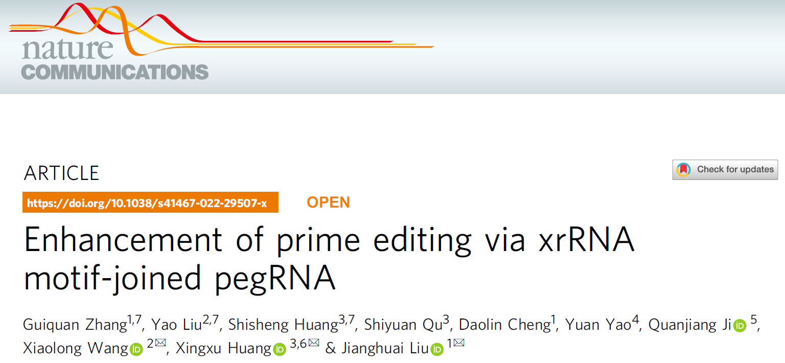 2022年04月06日,这篇题为“Enhancement of prime editing via xrRNA motif-joined pegRNA”的论文发表于《自然-通讯》杂志(Nature Communications)。该工作的第一作者(共同)为日本无码av 模式所博士生张贵泉、刘尧(西北农林科技大学)和黄诗圣(上海科技大学);通讯作者分别为刘江怀、黄行许(上科大)与王小龙(西农)教授。研究工作受到科技部重点研发计划等项目的资助。