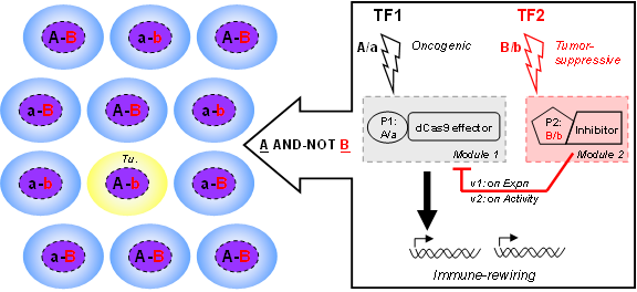 肿瘤的免疫治疗近来取得了巨大进展。进一步开发可定位于肿瘤病灶、而非全身性的免疫干预方法,将有望推动更高效低毒的免疫治疗。新兴的合成生物学为这种“智能化药物”的研发提供了可能,近年来基于基因组编辑技术的CRISPRa/i表观遗传调控工具的出现,更是为灵活实现肿瘤功能重编创造了条件。然而,目前许多识别肿瘤中高表达转录因子(transcription factor, TF)的合成基因环路缺乏严格的肿瘤特异性。因此,如何运用肿瘤中通常发生特异失活的转录因子(如p53)信息来精准门控肿瘤免疫重编是令人关注的问题。