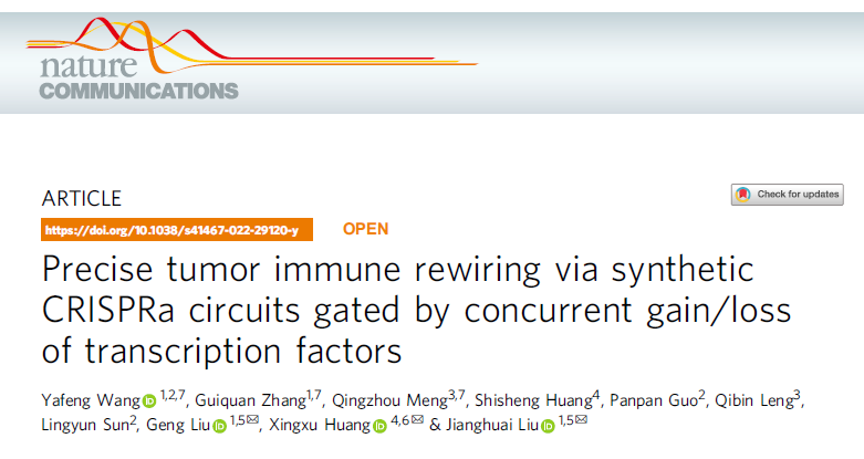 2022年3月18日,日本无码av 模式动物研究所、医药生物技术国家重点实验室成员团队协同上海科技大学、南京市鼓楼医院等合作单位在《自然-通讯》杂志(Nature Communications)发表了题为“Precise tumor immune rewiring via synthetic CRISPRa circuits gated by concurrent gain/loss of transcription factors”的研究论文。该研究首次构建了响应肿瘤细胞中转录因子信号同时获得和丢失的CRISPRa基因环路,一方面能精准识别肿瘤,另一方面能恰当启动抗肿瘤免疫,产生特异及有效的治疗效应。