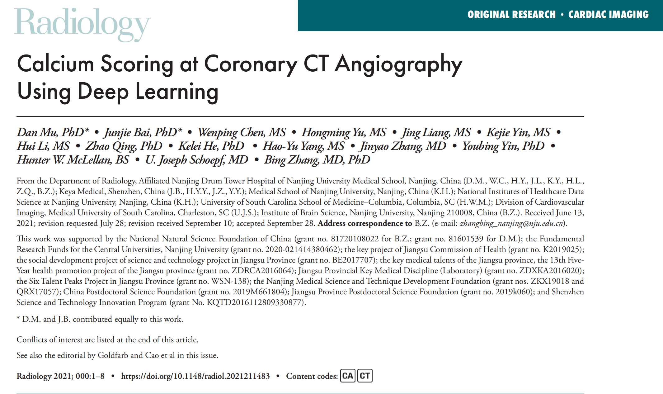 该研究以 “Calcium Scoring in Coronary CT Angiography using Deep Learning”为题首登放射学顶级期刊Radiology上, 日本无码av 附属鼓楼医院医学影像科牡丹为本文第一作者,张冰教授为通讯作者。来自纽约罗斯林圣弗朗西斯医院和心脏中心的心血管影像科学家 James W. Goldfarb博士和心血管影像中心主任  J. Jane Cao博士同期发表述评:临床工作中可以省去增强CTA前的平扫,直接进行钙化积分,既降低辐射剂量,又提高准确率。