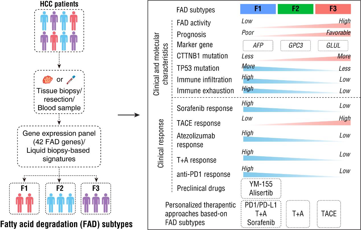 研究人员发现,肝癌病人根据FAD活性可以分为F1、F2及F3三型,不同分型肝癌具有不同的临床病理、基因组、表观调控、代谢、信号通路及免疫特征。F1型肝癌对Sorafenib敏感,F3型抵抗。F1型肝癌对TACE治疗抵抗,而F3型肝癌对TACE治疗敏感。F1型肝癌对PD1治疗敏感,而F2、F3型肝癌对PD1治疗抵抗。F1型肝癌对PD-L1治疗敏感,而F3型肝癌对PD-L1治疗抵抗。F1、F2型肝癌对T+A治疗敏感,而F3型肝癌对T+A治疗抵抗。可以通过液体活检的方法,检测血清代谢物或蛋白,进行FAD分型诊断,从而达到无创预测肝癌患者不同治疗疗效的目的。该研究结果有望为晚期肝癌患者治疗方案选择提供理论依据。
