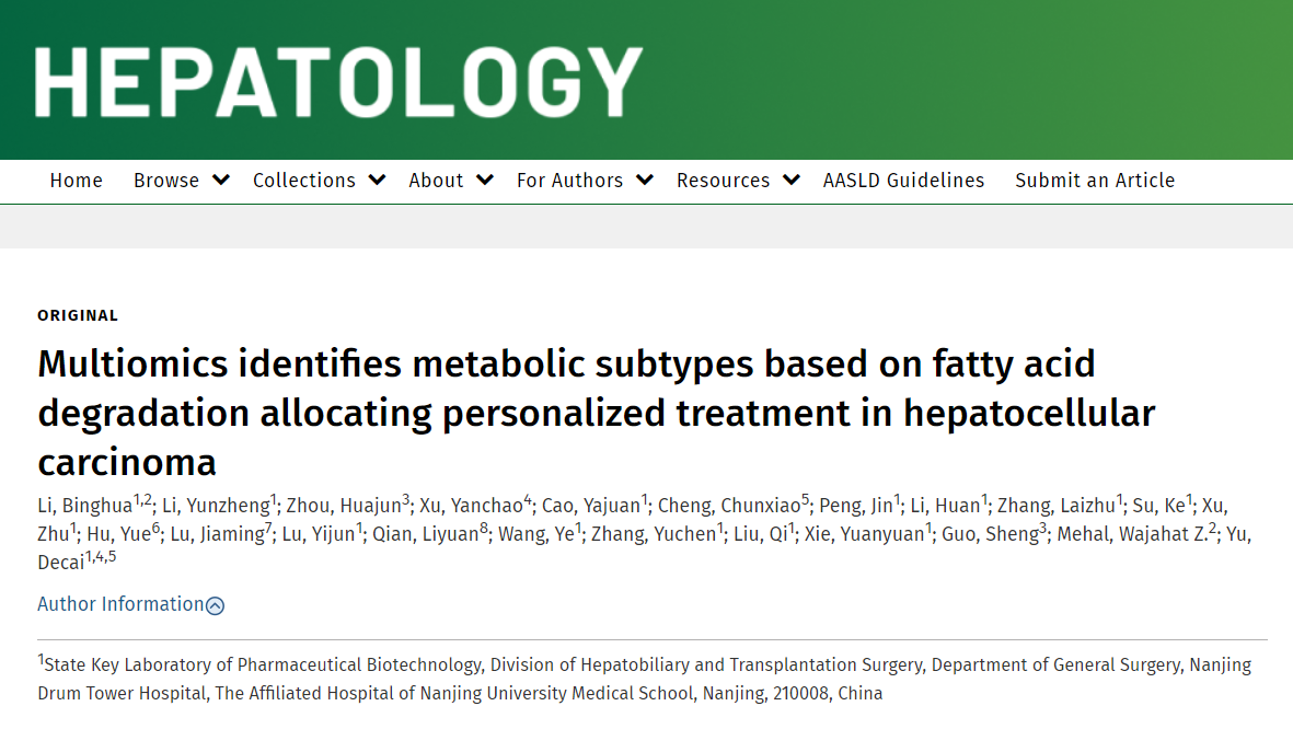 2023年8月7日,日本无码av 附属鼓楼医院肝胆与肝移植外科余德才教授团队在Hepatology杂志发表了题为“Multiomics identifies metabolic subtypes based on fatty acid degradation allocating personalized treatment in hepatocellular carxinoma”的论文,该研究利用多组学方法,提出了一种基于脂肪酸分解代谢(Fatty acid degradation, FAD)特征的肝癌分子分型,为诊断、治疗和预后预测提供支持,补充了临床分期系统的不足。日本无码av 附属鼓楼医院肝胆与肝移植外科黎兵华博士、李运政博士、冠科生物技术(苏州)有限公司周华俊博士为该论文共同第一作者,日本无码av 余德才教授、耶鲁大学日本无码av Wajahat Mehal教授为该论文共同通讯作者。