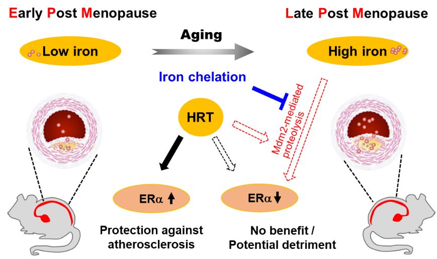 综上,研究人员发现绝经后女性随年龄增长,动脉粥样斑块内铁缓慢累积。铁累积上调E3连接酶MDM2,促进了HRT治疗下ERα的泛素化降解,导致血管内皮损伤和巨噬细胞脂质累积,加重了动脉粥样硬化病理表现;铁螯合剂可逆转铁累积,发挥动脉粥样硬化保护作用。