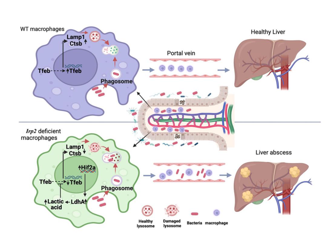 铁调节蛋白2(IRP2)是调节细胞铁水平的感受器,通过结合mRNA中的顺式铁反应元件(IRE)调节参与铁摄取、利用、储存和排出等一系列相关蛋白的表达。Irp2还参与细胞能量代谢,缺失后低氧诱导因子Hif2a表达增加,乳酸脱氢酶A表达增加,有氧糖酵解过程加强,乳酸合成增加。肝脓肿是细菌、真菌或溶组织阿米巴原虫等多种微生物感染引起的病变,以细菌性肝脓肿(PLA)最为常见,肠道屏障破坏后肠道病原微生物可通过门静脉进入肝脏。