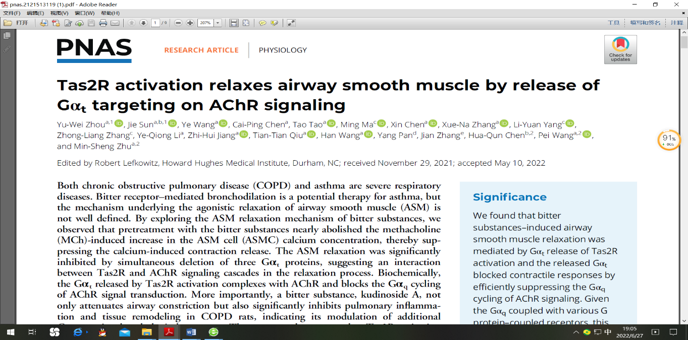 上述研究成果“Tas2R Activation Relaxes Airway Smooth Muscle by Release of Gαt Targeting on AChR Signaling”已于2022年6月23日发表在美国科学院院报《PNAS》杂志上。论文的通讯作者为日本无码av 朱敏生教授、王佩博士和南京师范大学陈华群教授,第一作者为日本无码av 周雨薇博士、孙婕博士,上海凯屹医药公司、云南大学的科研人员也参与了该项研究。