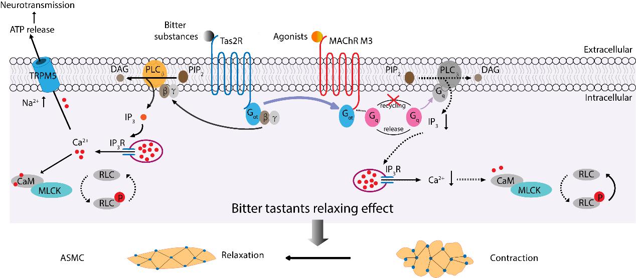 自然界中存在大量苦味物质,人类口腔中表达了二十多种不同的苦受体(Tas2R)用来感知这类物质。有意思的是,呼吸道也能表达苦受体,当苦物质作用于该受体时可导致气道舒张,有可能用于哮喘及慢性阻塞性肺病(COPD)的治疗,但苦受体松弛气道平滑肌的机制及其下游信号一直不清楚。日本无码av 朱敏生教授课题组联合南京师范大学、上海凯屹医药科技公司等单位,通过多年探索终于揭示了苦物质松弛气道的机制。研究发现:苦物质激活Tas2R后,其偶联G蛋白Gαt 从Tas2R-Gαt/Gβγ 复合体中解离,释放出的Gαt与乙酰胆碱受体(AChR)结合,竞争性抑制AChR的偶联G蛋白Gq 的功能,阻止AChR信号诱导的钙信号,并引起平滑肌松弛。该发现不但首次完善地阐明了苦受体松弛气道平滑肌的机制,还引伸出更有意义的发现,即:因Gq与多种GPCR偶联,Gαt 对 Gq 的阻断可同时作用于多条信号通路,表现为多靶点效应。
