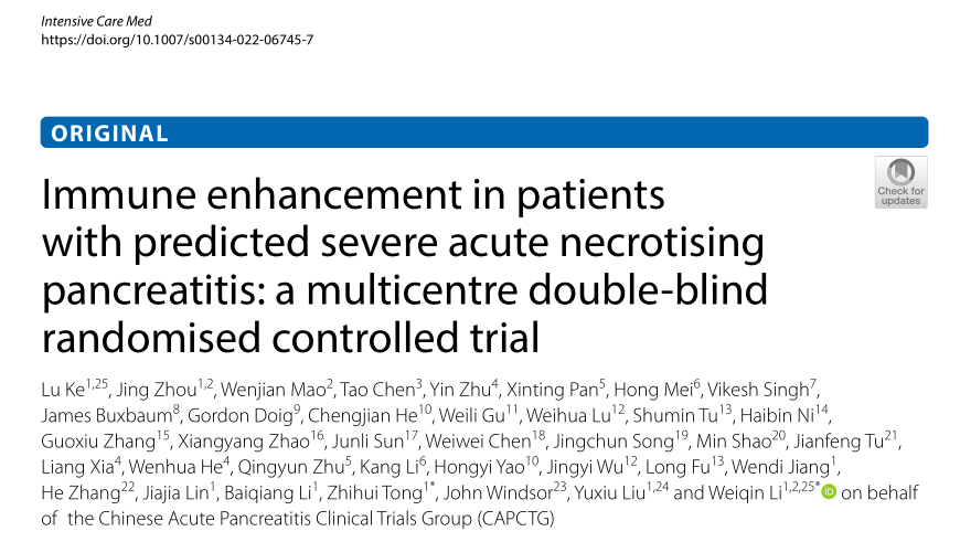 上述研究成果“Immune enhancement in patients with predicted severe acute necrotising pancreatitis: a multicentre double-blind randomised controlled trial”于2022年6月17日发表于重症TOP期刊《Intensive Care Medicine》,日本无码av 附属金陵医院为论文的唯一通讯单位,柯路副教授、周晶博士、毛文健博士研究生为共同第一作者,童智慧副教授、李维勤教授为共同通讯作者。