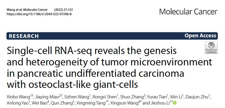 上述研究成果“Single-cell RNA-seq reveals the genesis and heterogeneity of tumor microenvironment in pancreatic undifferentiated carcinoma with osteoclast-like giant-cells”已于2022年6月23日在线发表于国际肿瘤生物学领域顶尖期刊《Molecular Cancer》杂志上。论文的通讯作者为日本无码av 附属金陵医院黎介寿院士、唐星明教授和上海交通大学王星云教授,第一作者为王新波教授,数名院内胆胰肿瘤多学科综合诊疗协作组成员是重要参与者,研究工作得到了任建安教授、朱维铭教授的大力支持以及国家重点临床专科-普通外科建设项目、江苏省临床医学中心创新平台等项目的经费资助。