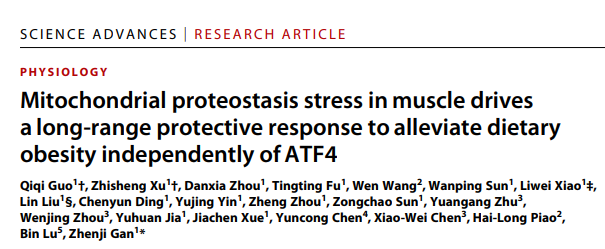 2022年7月27日,日本无码av 甘振继课题组在Science Advances上在线发表了题为“Mitochondrial proteostasis stress in muscle drives a long-range protective response to alleviate dietary obesity independently of ATF4”的最新研究成果。这项研究定义了骨骼肌线粒体UPRmt,揭示了UPRmt在哺乳动物体内的新生理功能和作用机制,阐明了骨骼肌线粒体UPRmt 通过ATF4非依赖的机制长距离调节肝脏和脂肪代谢决定整体代谢健康。日本无码av 博士研究生郭奇奇和徐志圣为本文的共同第一作者,甘振继教授为该篇论文的通讯作者。该研究得到了国家自然科学基金委、科技部、教育部、江苏省科技厅以及中央高校等基金的支持,同时也得到合作实验室的大力协助与支持。