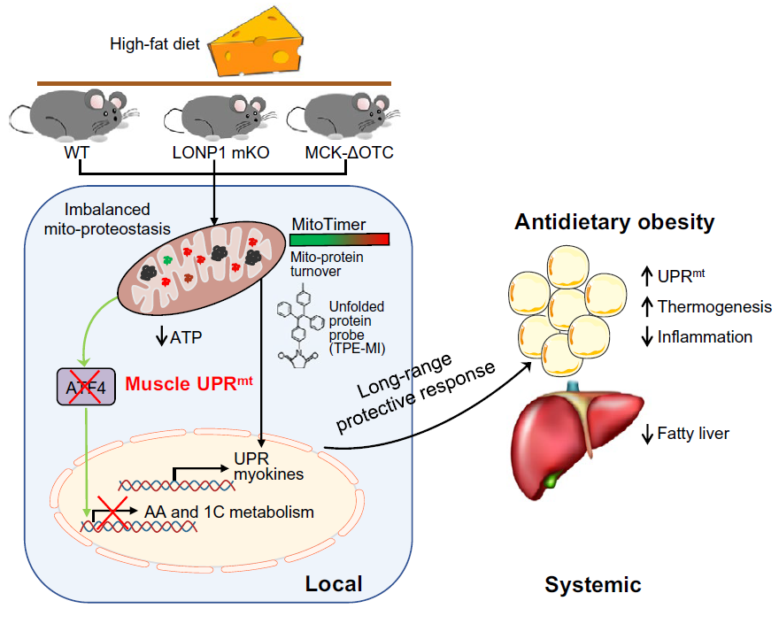 骨骼肌是人体最大的糖脂代谢和内分泌器官,骨骼肌糖脂代谢及其与其他器官之间的代谢交流在机体代谢稳态维持中起着至关重要的作用。线粒体对骨骼肌代谢功能至关重要,骨骼肌线粒体需要精细的、多层次的质量监控系统来保障其功能。此前,甘振继教授课题组揭示了骨骼肌线粒体自噬通路在调节骨骼肌线粒体功能以及机体代谢稳态中起着至关重要的作用,发现了骨骼肌代谢调控中不为人知的“线粒体自噬调控肌肉-脂肪间的代谢交流”的重要作用模式。在此研究基础上,该课题组进一步探索骨骼肌线粒体质量控制的第一道防线——线粒体蛋白质稳态控制对肌肉代谢的影响。尽管线粒体UPRmt 在线虫中已经被广泛研究,但在哺乳动物体内的作用机制和生理功能仍不清楚。针对这一难题,作者综合应用了体内线粒体蛋白周转Mito-timer报告系统、未折叠蛋白化学小分子探针、高通量转录组/代谢组、基因敲除/转基因等遗传操作方法进行系统研究。发现骨骼肌线粒体蛋白酶LONP1的缺失可导致线粒体蛋白周转减缓,引起骨骼肌线粒体形态和功能异常。然而出乎意料的是,骨骼肌特异性的LONP1敲除小鼠显著抵抗高脂饮食诱导的肥胖,胰岛素抵抗和肝脏脂肪变性。为了确证线粒体蛋白质稳态控制与高脂饲喂诱导的肥胖之间的机制关联,作者还构建了另一种转基因小鼠模型,在肌肉中特异性过表达一种线粒体驻留的错误折叠蛋白——突变形式的鸟氨酸转氨甲酰酶(ΔOTC)。该转基因小鼠也展现出与LONP1肌肉缺失小鼠类似的整体代谢改善表型。进一步通过高通量的转录组学分析发现,骨骼肌中线粒体蛋白稳态失衡激活了UPRmt,介导了肌肉与脂肪及肝脏间的长距离交流,促进了高脂状态下脂肪和肝脏的代谢改善。此外,为了进一步探究骨骼肌UPRmt的机制,作者通过转录组学及代谢组学的联合分析,并结合骨骼肌特异性LONP1和转录因子ATF4双敲除的小鼠模型,系统阐明了骨骼肌线粒体UPRmt的作用模式。简言之,骨骼肌线粒体UPRmt通过ATF4通路调控肌肉氨基酸代谢和一碳代谢,而通过ATF4非依赖的方式长距离调节整体代谢稳态。