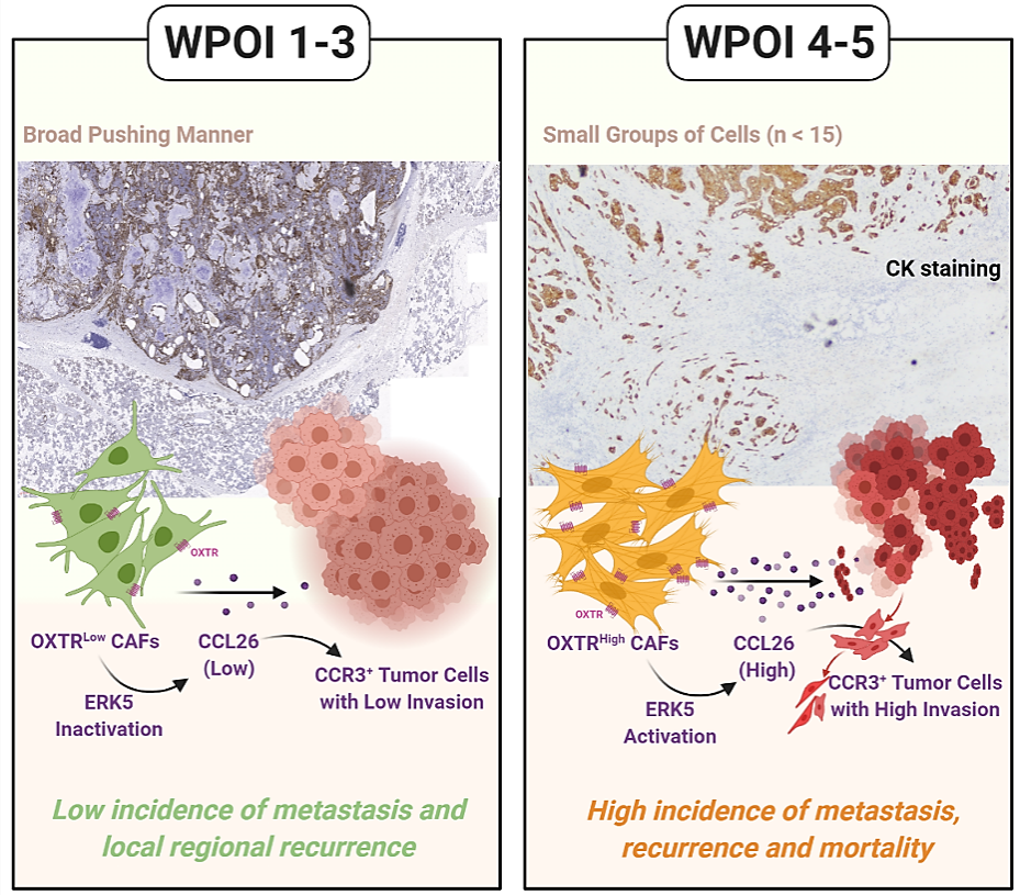 口腔鳞癌肿瘤细胞与正常组织接触处存在多种肿瘤浸润方式,表现为:低浸润型(Ⅰ型.推进式;Ⅱ型.指状浸润式;Ⅲ型.团块状)和高浸润型(Ⅳ型.条索状或者单细胞;Ⅴ型.距主癌巢1毫米外存在肿瘤卫星灶)。最差浸润方式(Worst pattern of invasion,WPOI)是指一个瘤体所具有的最高级别的浸润方式。本研究团队前期发现,WPOI是早期OSCC患者术后复发的重要影响因素;WPOI 4-5的患者其生存时间明显缩短,且术后出现淋巴结转移的可能性更高。本团队进一步分析了不同WPOI型的肿瘤微环境成分,发现间质中的肿瘤相关成纤维细胞(CAFs)可能是促进不同WPOI分型的重要因素;而对不同WPOI型肿瘤组织中的CAFs进行高通量分析,明确催产素受体(Oxytocin receptor,OXTR)阳性的CAFs在WPOI 4-5型肿瘤微环境中显著富集。催产素(OXT)-OXTR信号作为重要的心理、生理影响因素,具有情绪和压力管理、调控炎症和抗氧化等作用,但是在不同类型癌症中的作用还没有定论。进一步体内外实验发现,OXTR可通过ERK5激酶重塑肿瘤间质组成并促进CCL26分泌,诱导肿瘤细胞的组织浸润和淋巴结转移,为口腔癌的复发和转移研究提供新的思路。