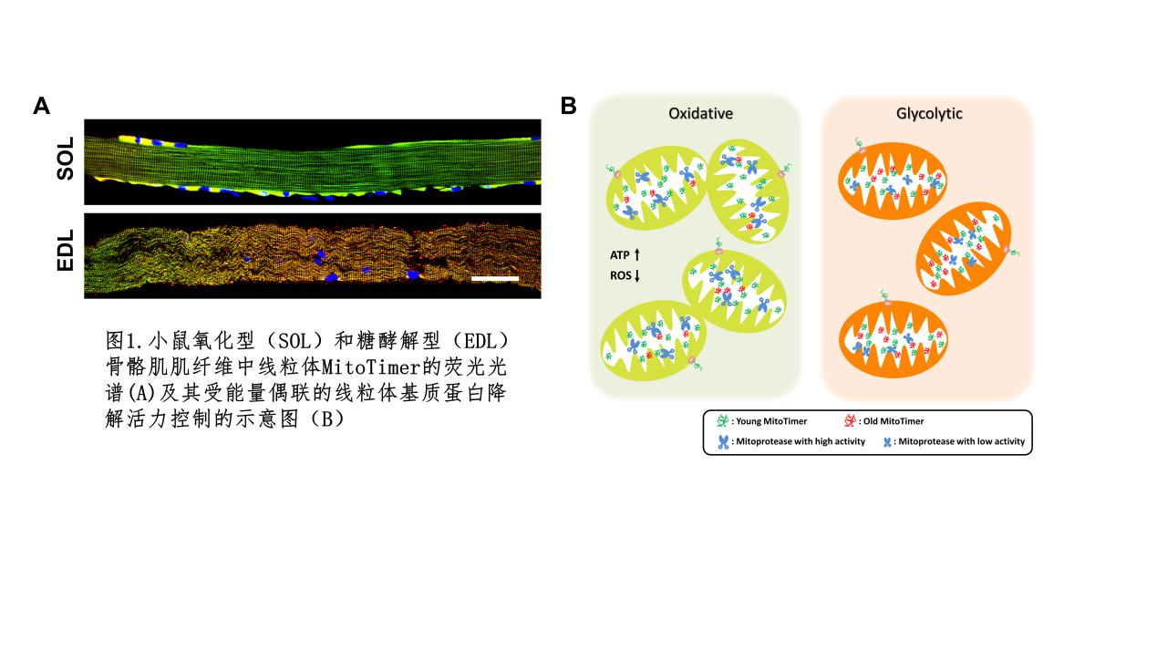 Timer是一个早年建立的荧光光谱可在一定时间内发生特定转换的荧光蛋白(定义为由绿色荧光转换为红色荧光),MitoTimer则是能够定位于线粒体基质的Timer蛋白。将Timer(MitoTimer)在细胞中表达后,虽然Timer的两种荧光光谱似乎能反映细胞(或线粒体)中“新”、“老”Timer蛋白的构成,但其整体荧光光谱(红绿比)可能受到多种因素的影响,Timer的这种随时间改变光谱的特性或Timer的荧光光谱用于研究生物学过程的最佳场景尚不明确。日本无码av 模式动物研究所的刘耕课题组通过建立MitoTimer的小鼠报告系统并解析生理稳态下小鼠骨骼肌中MitoTimer的荧光光谱,首次发现处于不同氧化代谢水平的骨骼肌组织和肌纤维中MitoTimer荧光光谱存在巨大差异(如:氧化代谢旺盛的慢肌纤维以绿色荧光为主,而以糖酵解为主要代谢模式的快肌纤维则以红色荧光为主)。同时,年轻小鼠以及锻炼后小鼠骨骼肌MitoTimer均呈现偏绿荧光光谱。在细胞体系中,提升氧化代谢水平同样能促进MitoTimer偏绿光谱的呈现。进一步的研究排除了线粒体自噬以及生物合成等多种因素对氧化状态下MitoTimer荧光光谱的影响,揭示线粒体基质蛋白水解酶的活力直接影响了MitoTimer的降解速率,尤其是MitoTimer红色荧光的强度,是决定MitoTimer荧光光谱的主要因素,而这种“新”、“老”蛋白降解动力学的内在区别可能正是Timer特性的在活细胞中的反映。重要的是,线粒体蛋白酶活力、MitoTimer以及线粒体呼吸链蛋白降解和更新都与线粒体能量状态和水平紧密偶联。因此,偏绿的MitoTimer荧光光谱界定和指示了线粒体的一种活跃状态,即特定氧化代谢状态下供能效率的提升(高氧化磷酸化水平)。线粒体蛋白酶作为线粒体重要的质量控制系统,负责线粒体电子传递链蛋白复合体的组装以及损伤蛋白的清除等功能,因此该研究的发现提示线粒体高氧化磷酸化状态存在正向反馈的维持机制。更多实验结果也证实这种线粒体的活跃状态反而伴随着较低活性氧/氧化损伤以及线粒体自噬水平,显示出线粒体代谢适能的特定状态。综上,MitoTimer偏绿荧光光谱的解析揭示了与线粒体高水平氧化磷酸化状态相偶联的质量控制机制,并指示高效而低氧化损伤的特定线粒体活跃状态。