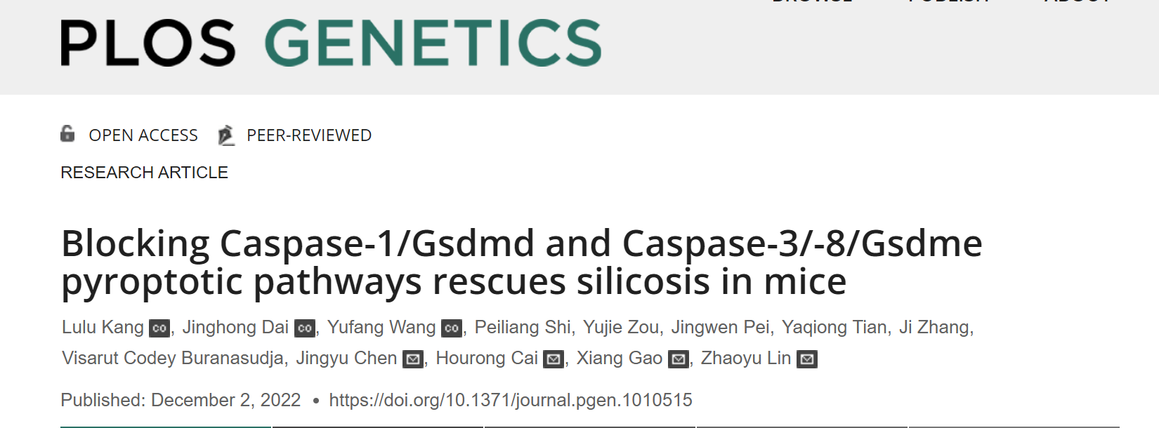 On December 2, 2022, Zhaoyu Lin and Xiang Gao’s research group from Model Animal Research Center, Nanjing University Medical School, Hourong Cai’s research group from Nanjing Drum Tower Hospital, and Jingyu Chen’s research group from Wuxi People’s Hospital jointly published a research paper “Blocking Caspase-1/Gsdmd and Caspase-3/-8/Gsdme pyroptotic pathways rescues silicosis in mice” in PLOS Genetics (DOI: 10.1371/journal.pgen.1010515). This work reveals that silica-induced cell lytic death and lung inflammation depend on two pyroptotic pathways, Gsdmd and Gsdme. In addition, the paper also analyzes the upstream caspases activation and downstream cytokine release in silica-induced pyroptosis, and finds a potential new treatment for silicosis.